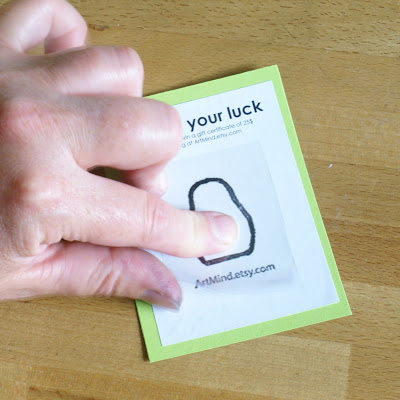 1. Beforehand you print out a design that you want to be on the scratch off lottery tickets. If your printer can take thick paper you can print it directly on the cardboard and skip this part. If you do it in two steps, it is nice to get a fun color background paper and glue the design onto the card.